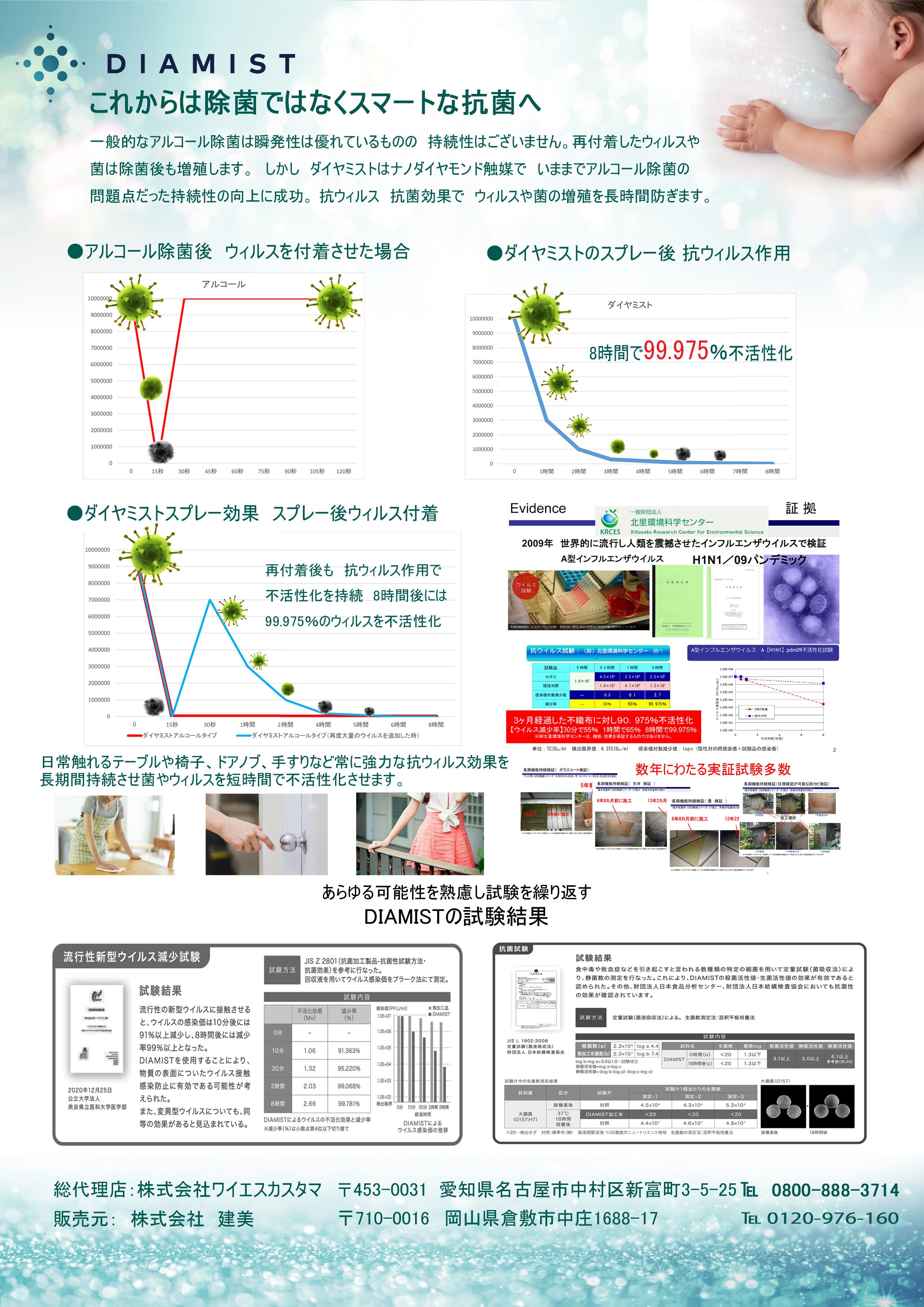 アルコール70%+ナノダイヤモンド触媒により 今までのアルコールスプレーの除菌効果に加え 抗ウィルス抗菌効果が長時間持続することに成功。
